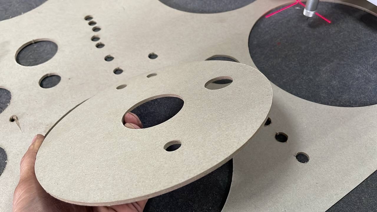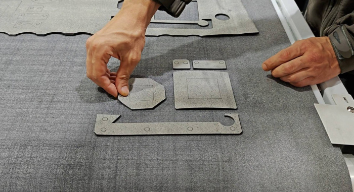 Отдельное удовольствие - наблюдать, как программное обеспечение, встроенное в раскроечный комплекс, автоматически раскладывает детали на листе. Контуры выстраиваются так, что между ними почти не остаётся пустого места. Отходы минимальны, а при дорогих материалах это уже не мелочь, а серьёзная экономия. Причём оператору не нужно ничего высчитывать вручную - система сама оптимизирует раскрой.