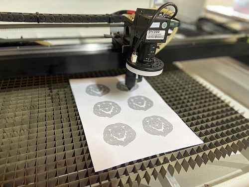 При печати ставите метки по периметру вырезаемых объектов в количестве от 4 и более штук для сложных контуров. Печатаете или вышиваете файл. Создаете файл для резки в котором надо оставить метки и вектора по которым станок будет резать. Это может быт как контур детали так и любой другой вектор. Кладете материал в станок. В станке есть возможность установить погрешность на неровную укладку материала (положили немного под углом) так же и на изменения геометрии при нанесении изображений на материале. Загружаете файл для резки в программу. Выбираете какие вектора будут вырезаться и устанавливаете им параметры резки (скорость и мощность). запускаете процесс резки. станок проходит по всем меткам, находит их. После нахождения всех меток станок корректирует в программе файл для резки и вырезает заданные вектора.